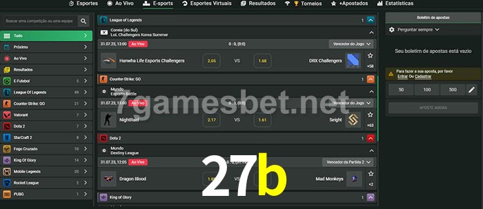 O 27b oferece uma grande seleção de opções de apostas em e-sports com probabilidades competitivas